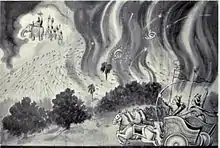 It is said that Agni, the god of fire needed to burn down the forest so that he could satisfy his hunger. There was no other thing that would have satisfied his hunger. But each time, he put up a fire there, Indra made it rain and the fire was put to a stop. So in disguise, Agni approached Krishna and Arjuna and asked for help. The Mahabharata states that Indra was the protecting deity (deva) of Khandava forest, which is why the region was known as Indraprastha.[3] When the forest was being burned, Indra attacked Arjuna with his bolt (vajra), injuring him.[4] But Arjuna defeated all gods, Gandharvas and demons in that fierce battle and burnt the entire forest.[5] Chhapadeshwar Mahadev Mandir in Kharkhoda, Haryana was the part of Khandav Van.[6][7][8]