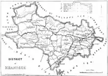 Khandesh was a district in the Bombay Presidency.[8] In 1906, the district was divided into two districts: East Khandesh, headquartered at Jalgaon, had an area of 11,770 km2 (4,544 sq mi), while West Khandesh, headquartered at Dhule, had an area of 14,240 km2 (5,497 sq mi); their respective populations were 957,728 and 469,654 in 1901.[9]