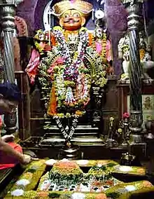 Khandoba (IAST: Khaṇḍobā), Martanda Bhairava, Malhari, or Malhar is a Hindu deity worshiped as a manifestation of Shiva mainly in the Deccan plateau of India, especially in the state of Maharashtra. He is the most popular Kuladaivat (family deity) in Maharashtra.[1] He is also the patron deity of select warrior, farming castes, Dhangar community and Brahmin (priestly) castes as well as several of the hunter/gatherer tribes that are native to the hills and forests of this region. The cult of Khandoba has linkages with Hindu and Jain traditions, and also assimilates all communities irrespective of caste, including Muslims. The worship of Khandoba developed during the 9th and 10th centuries from a folk deity into a composite god possessing the attributes of Shiva, Bhairava, Surya and Kartikeya (Skanda). He is depicted either in the form of a linga, or as an image of a warrior riding on a bull or a horse. The foremost centre of Khandoba worship is Jejuri in Maharashtra. The legends of Khandoba, found in the text Malhari Mahatmya and also narrated in folk songs, revolve around his victory over demons Mani-malla and his marriages.