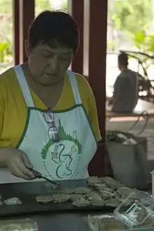 Khanom babin or coconut cake is one of the traditional desserts of Thailand.[2] There are two ideas of the history of Khanom babin. The first idea is that Khanom Babin originated from the Amphoe Tha Ruea, Ayutthaya Province.[3] During King Rama V's period, it was called Khanom Paabin and was made by aunt Bin. As time passed, it became called Khanom babin. The second idea is that Khanom babin was influenced by the queijada de Coimbra, which is a dessert from the Portuguese city of Coimbra. The origin of the name Khanom babin comes from the last word of queijada de Coimbra. This word ("Coimbra") ends in "-bra" which sounds like "ba" (Thai: บ้า). The Portuguese use cheese in the queijada de Coimbra, but Thais put in young coconut instead. The main ingredients of Khanom babin are glutinous flour, arrowroot, grated coconut, eggs, oil and sugar. It looks like a tiny pancake. The taste is not too sweet or greasy and it smells good. This dessert is commonly eaten on almost every occasion. However, Khanom babin is now hard to find because only a few vendors sell it. Khanom babin can be found in local open markets and at roadside stands.[4]