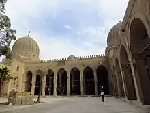 The mosque area is comparatively plain, but is also characterized by its uncommon stonework. Instead of the usual wooden ceiling found elsewhere in most Mamluk (or Cairene) mosques, the ceiling is composed of stone vaults, with a small higher dome rising right in front of the mihrab. A stone dikka (reading platform) also stands at the edge of the prayer hall.[1][2][3]