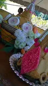 Around September to October annually people participate in "Ching Pretah Day" which is a giving day to ancestor spirits, ghosts, and demons. On this day people will bring desserts such as kanom la, kanom ba, kanom pong, kanom thian, and kanom bae-som (also called joah hu) to the ceremony. They also bring rice, garlic, shrimp paste, chili, coconuts, sugar cane, salt, onions, bananas, candles, and joss-sticks. Then they will set up a table. After the prayer people gather around the table and snatch (it is a tradition, people do it just for fun) food for themselves, believing that it will bring them good luck. Every dessert offered to the spirits represents a particular object. Kanom la is a blanket, kanom ba is a coin, kanom pong is jewelry, kanom bae-som is money, and kanom thian is a pillow.