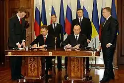 The agreement, signed on 21 April 2010 in Kharkiv, Ukraine, by Ukrainian President Viktor Yanukovych and Russian President Dimitry Medvedev and ratified by the parliaments of the two countries on 27 April 2010, aroused much controversy in Ukraine. The treaty was a continuation of the 1997 Black Sea Fleet Partition Treaty between the two states. Shortly after the March 2014 annexation of Crimea by the Russian Federation,[7] Russia unilaterally terminated the treaty on 31 March 2014.[8][9]