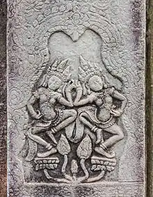 The styles employed by Angkorean artists in the decoration of lintels evolved over time, as a result, the study of lintels has proven a useful guide to the dating of temples. Some scholars have endeavored to develop a periodization of lintel styles.[28] The most beautiful Angkorean lintels are thought to be those of the Preah Ko style from the late 9th century.[29]