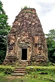 The central sanctuary of an Angkorian temple was home to the temple's primary deity, the one to whom the site was dedicated: typically Shiva or Vishnu in the case of a Hindu temple, Buddha or a bodhisattva in the case of a Buddhist temple. The deity was represented by a statue (or in the case of Shiva, most commonly by a linga). Since the temple was not considered a place of worship for use by the population at large, but rather a home for the deity, the sanctuary needed only to be large enough to hold the statue or linga; it was never more than a few metres across.[11] Its importance was instead conveyed by the height of the tower (prasat) rising above it, by its location at the centre of the temple, and by the greater decoration on its walls. Symbolically, the sanctuary represented Mount Meru, the legendary home of the Hindu gods.[12]