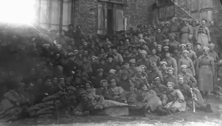 Zhurari's Whites in Tiraspol attempted to provide assistance to the rebels, but moved in too late. In early February, they reportedly acted as negotiators between armed Bolsheviks, led by the Bessarabian Grigory Kotovsky, and the UNR authorities, allowing the latter to withdraw peacefully from Tiraspol.[144] Kotovsky was then pushed out by French troops of the 58th Infantry Regiment, and found himself crossing into Bessarabia, where he managed to chase Romanian soldiers out of Tighina.[145] A French–Romanian division-strength force, assisted by the Polish Blue Army, stepped in to repel Kotovsky's partisans, and reoccupied Tiraspol. Zhurari's men declared their neutrality, but nevertheless found themselves labeled as enemy troops by the French army command; they then joined the intervention forces and participated in political repression, executing among others the father of Bolshevik leader Pavel Tcacenco.[146]