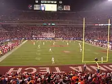 The line where the ball is placed for kickoff varies among the rule books. It is placed on the kicking team's 30-yard line in six-man football, 35-yard line in college and professional outdoor football, 40-yard line in American high school football, 45-yard line in amateur Canadian football, and the goal line in indoor and arena football. For the 2016 season only, the Ivy League placed the ball on the 40-yard line in conference games.[1] All players on the kicking team except the kicker (and, if used, a holder) must not cross the line at which the ball is placed until the ball is kicked. The receiving team must stay behind the line that is 10 yards from where the ball is placed. The ball can be fielded by the receiving team at any point after it has been kicked, or by the kicking team after it has traveled 10 yards or has been touched by a member of the receiving team. In American football (but not Canadian) touchback and fair catch rules apply to the kicked ball. If it is fielded by the kicking team, it is called an onside kick. A low, bouncing kick is called a squib kick. Although a squib kick typically gives the receiving team better field position than they would if a normal kick had been used, a squib kick is sometimes used to avoid giving up a long return, as well as use up a valuable amount of time on the clock, as it is impossible to fair catch such a kick. It is usually done when a team takes the lead in the final seconds, and is done to safely run out the remainder of the clock. Squib kicking with more than 20 seconds remaining has had unfortunate results (a line drive kick is more common when there are 20 to 50 seconds remaining; the typical hurry-up offense drive takes over a minute), but has been done by some teams.