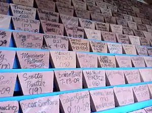 To shock people into action, Latiker set up a stone memorial at 11623 South Michigan Avenue[5] in memory of all the young people who have lost their life to gun violence since 2007.[6] There are more than 600 stones lining the memorial, each representing a victim.[7]