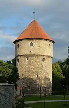 Kiek in de Kök (Low German: Peep into the Kitchen) is an artillery tower in Tallinn, Estonia, built in 1475. It gained the name Kiek in de Kök from the ability of tower occupants to see into kitchens of nearby houses. The tower is 38 m (125 ft) high and has walls 4 m (13 ft) thick. Cannon balls dating back to 1577 are still embedded in its outer walls.