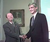 Miyazawa later returned to frontbench politics when he was once again appointed finance minister from 1998 to 2001 in the governments of Keizō Obuchi and Yoshirō Mori. In 1998, Miyazawa replaced Hikaru Matsunaga as finance minister.[5][6] He served a total 14 terms in both upper and lower houses before retiring from politics in 2003.[3][7] The reason for his retirement was that then prime minister Junichiro Koizumi set an age limit of 73 for LDP political candidates.[8]