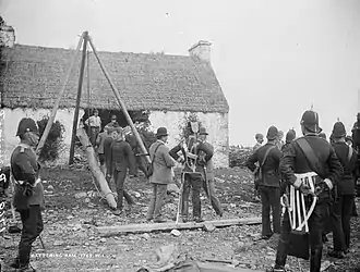However, the famine years (1845–1849) brought much hardship to Kilrush. Famine, evictions, fever and cholera reduced the population of south-west Clare to such an extent that it never again attained its pre-famine numbers. This was vividly dramatised for radio in 1980.[4] In the post-famine era, the Vandeleur name became synonymous with the worst of landlord evictions, with over 20,000 evicted in the Kilrush Union. The Kilrush workhouse witnessed terrible deprivation and deaths. By that stage, Hector Vandeleur had succeeded John Ormsby Vandeleur.