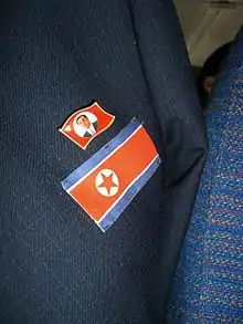Recently, badges have been sold to tourists at the Kim Il-Sung and Kim Jong-Il foundation building in Pyongyang for a 100 Euro 'donation', and after receiving permission and help of a local.[16] Badges have been smuggled out of the country for sale and can be found in Chinese cities in particular,[17] although selling them is illegal in China as well. Both authentic and counterfeit badges are sold in Tumen.[18] Most badges found outside of the country are counterfeits,[15] such as those regularly on sale in Dandong.[19]