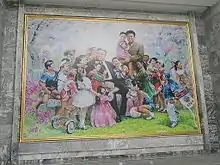 Kim was the focus of an elaborate personality cult inherited from his father and founder of the DPRK, Kim Il-sung. Kim Jong-il was often the centre of attention throughout ordinary life in the DPRK. On his 60th birthday (based on his official date of birth), mass celebrations occurred throughout the country on the occasion of his Hwangap.[58] In 2010, the North Korean media reported that Kim's distinctive clothing had set worldwide fashion trends.[59]