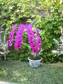 Kimilsungia is a hybrid orchid of the genus Dendrobium.[1] It is a clone of a plant that was created in Indonesia by orchid breeder Carl Ludwig C. L. Bundt, who in 1964 registered the grex name Dendrobium Clara Bundt for all orchids of the same ancestry, naming it after his daughter. It has a complex ancestry from cultivated orchids.[1] An attempt was made to register the grex name Dendrobium Kimilsungia, but this is not valid, it is a later synonym of Dendrobium Clara Bundt.[1] As a cultivar name (applying to only part of the grex), the correct name would be Dendrobium Clara Bundt 'Kimilsungia'.[1] Another grex name Dendrobium Kimilsung Flower refers to plants of related but different ancestry.[1]
