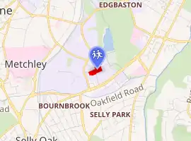 By 1936 the old building on New Street had become a fire risk, and plans were made by the Governors and the then Headmaster, Edwin Thirlwall England, to move to a new site at Edgbaston Park Road/Bristol Road, in Edgbaston, along with the girls' school. Ironically, the temporary buildings erected on the new site in 1936 burnt down. The school was forced to move, if only for a short time, to the University of Birmingham's Great Hall and surrounding buildings until new temporary buildings could be erected. The move was complicated by the outbreak of the Second World War, and the subsequent evacuation of the pupils to Repton School for a short period. By 1940 enough of the new buildings designed by Holland W. Hobbiss had been built for the school to begin lessons. In 1945 the schools became direct grant grammar schools, which meant that the Governors had to relinquish some control over the running of the school.[6] The schools were finally completed around 1948, although the 1950s saw a period of expansion under the Chief Master Ronald G. Lunt, appointed 1952, including the construction of a swimming pool and the building of a chapel from a specially salvaged portion of the upper corridor of the New Street building.[7] In 1976 the two schools became, once again, independent schools, due to the termination of the Direct Grant scheme by the then Prime Minister Harold Wilson.[8][9] The school remains independent and is still on the Edgbaston site.[10]