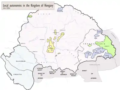 Coloman routed two bands of crusaders (the perpetrators of the Rhineland massacres) who were plundering the Western borderlands[64] and defeated Petar Svačić in Croatia.[60][65] The late 14th-century Pacta conventa states that Coloman was crowned king of Croatia after concluding an agreement with twelve local noblemen.[66] Although most probably a forgery, the document reflects the actual status of Croatia proper,[67] which was never incorporated into Hungary.[63] In contrast, the region known as Slavonia, between the Petrova Mounts and the river Dráva, became closely connected to Hungary.[68] Here many Hungarian noblemen received land grants from the monarchs.[68] Zadar, Split and other Dalmatian towns also accepted Coloman's suzerainty in 1105, but their right to elect their own bishops and leaders remained unchained.[69][70] In Croatia and Slavonia, the sovereign was represented by governors bearing the title ban.[68] Likewise, a royal official, the voivode, administered Transylvania, the eastern borderland of the kingdom.[71]