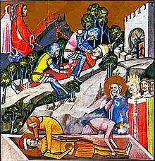Batu Khan, who was the commander of the Mongol armies invading Eastern Europe, demanded Béla IV's surrender without a fight in 1240.[132][133] The king refused, and ordered his barons to assemble with their retinue in his camp at Pest.[134] Here, a riot broke out against the Cumans and the mob massacred the Cuman leader, Kuthen.[129][135] The Cumans soon departed and pillaged the central parts of the kingdom.[136] The main Mongol army arrived through the northeastern passes of the Carpathian Mountains in March 1241.[129][137] Royal troops met the enemy forces at the river Sajó, where the Mongols won a decisive victory in the battle of Mohi on April 11, 1241.[135] From the battlefield, Béla IV fled first to Austria, where Duke Frederick II held him for ransom.[136] Thereafter, the king and his family found refuge in Klis Fortress in Dalmatia.[138] The Mongols first occupied and thoroughly plundered the territories east of the river Danube.[139] They crossed the river when it was frozen in early 1242.[136] A contemporary account by Abbot Hermann of Niederalteich stated that "the Kingdom of Hungary, which had existed for 350 years, was destroyed".[136][138]