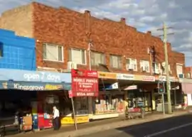 The main shopping centre is located on Kingsgrove Road, south of Kingsgrove railway station. Commercial and industrial developments are located on the northern side of the railway line, west of Kingsgrove Road. There are also some commercial developments scattered along Stoney Creek Road and Canterbury Road. A small group of shops on Stoney Creek Road is known as the Kingsway locality. Kingsgrove RSL Club is located in Brocklehurst Lane behind Kingsgrove Road.[5]