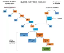 During the contact activation system (CAS), also known as the intrinsic pathway, the binding of HK, factor XII (FXII), and prekallikrein (PK) to an anionic surface initiates blood coagulation and the kinin-kallikrein system through the activation of a cascade of enzymes.[11] Factor XII is a zymogen, and upon binding with tissue to the anionic surface, exhibits some protease activity, starting the enzymatic cascade.[12] Both the intrinsic and its corresponding extrinsic pathway, which is activated when outside trauma activates tissue factor (TF), an important glycoprotein, culminate in the activation of a serine protease called Factor X. Factor X is responsible for the conversion of prothrombin into an important protease in clotting called thrombin, which itself participates in the clotting cascade by activating more enzymes and proteins downstream in order to create even more thrombin.
