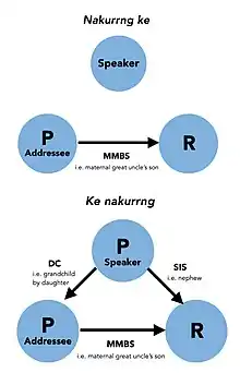 In Bininj Gun-Wok),[6] for example, the bi-relational kin-term nakurrng is differentiated from its tri-relational counterpart by the position of the possessive pronoun ke. When nakurrng is anchored to the addressee with ke in second position, it simply means 'brother' (which includes a broader set of relations than in English). When the ke is fronted, however, the term nakurrng now incorporates the male speaker as a propositus (P i.e. point of reference for a kin-relation) and encapsulates the entire relationship as follows: