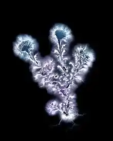 Kirlian photography is a collection of photographic techniques used to capture the phenomenon of electrical coronal discharges. It is named after Semyon Kirlian, who, in 1939, accidentally discovered that if an object on a photographic plate is connected to a high-voltage source, an image is produced on the photographic plate.[1] The technique has been variously known as "electrography",[2] "electrophotography",[3] "corona discharge photography" (CDP),[4] "bioelectrography",[5] "gas discharge visualization (GDV)",[6] "electrophotonic imaging (EPI)",[7] and, in Russian literature, "Kirlianography".