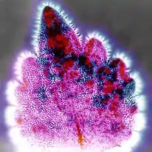 Visual artists such as Robert Buelteman,[24] Ted Hiebert,[25] and Dick Lane[26] have used Kirlian photography to produce artistic images of a variety of subjects. Photographer Mark D. Roberts, who has worked with Kirlian imagery for over 40 years, published a portfolio of plant images entitled "Vita Occulta Plantarum" or "The Secret Life of Plants," first exhibited in 2012 at the Bakken Museum in Minneapolis, and currently being marketed to botanical gardens and galleries across the United States. Additionally, he has experimented with techniques of coloring by hand as well as digitally.