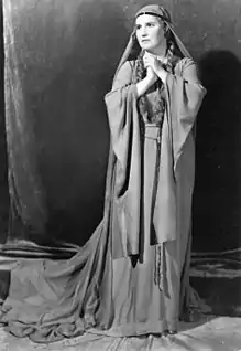 At the Met Flagstad became a pupil of vocal coach Hermann Weigert, who prepared her for all her roles with the company. Her debut at the Met, as Sieglinde in Die Walküre on the afternoon of 2 February 1935, created a sensation, though it was not planned as a special event. By this time, after weeks of rehearsals, Met management already knew what they had, but they nonetheless decided on a low key debut. Flagstad was unknown in the United States at the time. The performance was, however, broadcast nationwide on the Met's weekly syndicated radio program, and the first inkling of the deluge of critical praise to come was given when intermission host and former Met star Geraldine Farrar discarded her prepared notes, overwhelmed by what she had just heard, and breathlessly announced that a new star had just been born. Days later, Flagstad sang Isolde, and later that month, she performed Brünnhilde in Die Walküre and Götterdämmerung for the first time. Before the end of the season, Flagstad sang Elsa in Lohengrin, Elisabeth in Tannhäuser, and her first Kundry in Parsifal. Almost overnight, she had established herself as the pre-eminent Wagnerian soprano of the era. According to most critics, she still remains the supreme Wagnerian dramatic soprano on disc by virtue of her unique voice. It has been said that she saved the Metropolitan Opera from looming bankruptcy. Her performances, sometimes three or four a week in her early days at the Met, quickly sold out at the box office as soon as they went on sale. Her services to the Met were not from box office receipts alone; her nationwide personal appeals to radio listeners during Saturday matinee intermissions brought thousands of dollars in donations to the Met's coffers.[2] Fidelio (1936 and later) was her only non-Wagnerian role at the Met before the war. In 1935, she performed all three Brünnhildes in the San Francisco Opera's Ring cycle. In 1937, she first appeared at the Chicago City Opera Company.[3]