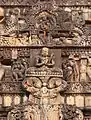 This monstrous face with bulging eyes sits also as an embellishment over the lintel of the gate to the inner sanctum in many Hindu temples signifying the reabsorption that marks the entry into the temple.[8] In Dravidian architecture and elsewhere it tops gavaksha (kudu, nasi) motifs. Mostly it is only a face, indeed very often only the upper jaw and top of the face is visible, although in some places its arms are portrayed as well. The motif can also sometimes be found in Shiva's matted hair.[9]