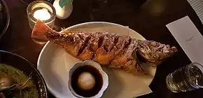 The fried fish has been singled out by reviewers as the restaurant's signature dish.[5][6] It consists of a whole fish or large cut like fish collar, scored in a diamond pattern, battered in potato or rice flour and flash fried. It is served with grated-daikon soy sauce for dipping.[24][27] Gill noted the rarity of seeing whole fish served in Vancouver, and lauded the kitchen for having the confidence to present the dish that way.[20][24]