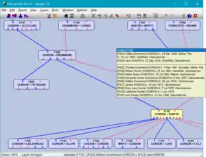 Unique, whole-tree display allows instant access to the data in any part of the family tree.[6] Multi-layering feature splits the list of families into a more easily managed display for large trees. The software imports and exports GEDCOM files and exports Web pages.[7] Data searches can be carried out using simple criteria or SQL statements.