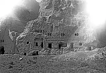 Some very early caves, now numbered 90-17 to 90-24, have been discovered since the 1990s in the lower parts of the cliff at the entrance of the central valley. These caves were square or rectangular with barrel-vaulted ceilings, but without any decorations.[53]