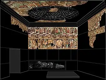 A large vaulted chamber is located in front of the "central pillar" column and a smaller rear chamber behind with two tunnel-like corridors on the sides linking these spaces. In the front chamber, a three-dimensional image of Buddha would have been housed in a large niche serving as the focus of the interior, however, none of these sculptures have survived at Kizil.[17] The rear chamber may feature the parinirvana scene in the form of a mural or large sculpture, and in some cases, a combination of both. The "central pillar" layout is possibly related to the structural design of Kara Tepe in northern Bactria.[18]