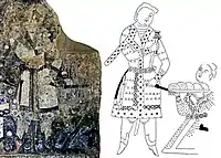 The earliest painted caves at Kizil are thought to be Cave of the Hippocampi (Cave 118) and Treasure Caves C and B (Caves 83 and 84 respectively).[81] Cave 118, possibly the earliest of the three, is located deep inside the central valley.[82] Cave 83 and 84 are located at the entrance of the same valley. These caves have simple architectural structures, together with paintings in a clear Indian style.[81] Noble or wealthy Tocharian donors from Kucha, wearing tunics, sometimes appear kneeling at the side of devotional paintings.[76]