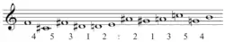 Analyses of the pitch material have fallen broadly into two camps. One, initiated by Robin Maconie,[33] holds that the piece is constructed from chromatic tetrachords; the other, founded by Dieter Schnebel[34] and continued by Jonathan Harvey,[35] maintains that the basis is actually a five-note set, consisting of that same tetrachord plus a note a minor third above (0,1,2,3,6), and ordered as a series: A, B, D, A♭, B♭, in a "succession of 5 proportions [that] runs subcutaneously through the whole piece".[34] In a passing reference to this piece, the Dutch composer Ton de Leeuw presents these same five notes in ascending scale order, which he describes as "rudiments of the 12-note series", but does not explain whether his diagram is to be understood as an ordered row or an unordered collection.[18] This same set, treated as unordered, has been taken as a starting point for a lengthy analysis by David Lewin,[36] while Christoph von Blumröder has published one nearly as long favouring Maconie's view.[37] One reviewer has judged Blumröder's analysis as a conclusive demonstration that the tetrachord is in fact the compositional basis, while conceding that Harvey and Lewin's view remains a valid construal of the piece viewed as a finished product.[38]