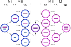 The extra chromosome is retained because of a nondisjunction event during paternal meiosis I, maternal meiosis I, or maternal meiosis II (gametogenesis). The relevant nondisjunction in meiosis I occurs when homologous chromosomes, in this case the X and Y or two X sex chromosomes, fail to separate, producing a sperm with an X and a Y chromosome or an egg with two X chromosomes. Fertilizing a normal (X) egg with this sperm produces an XXY offspring (Klinefelter). Fertilizing a double X egg with a normal sperm also produces an XXY offspring (Klinefelter).[34]