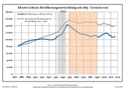 Development of population since 1875 within the current Boundaries (Blue Line: Population; Dotted Line: Comparison to Population development in Brandenburg state; Grey Background: Time of Nazi Germany; Red Background: Time of communist East Germany)