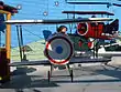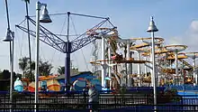 Motorcycle Chase, modernized steeplechase rollercoaster built in 1976 by Arrow Development, featured single motorbike themed vehicles racing side-by-side, each on one of four parallel tracks, launched together.[9] One or two riders straddled each "Indian motorcycle" attraction vehicle. The tubular steel monorail track closely followed dips and bumps in "the road" and tilted to lean riders about the curves. Gasoline Alley, an electric steel-guiderail car ride below, was built together and intimately intertwined, which enhanced ride-to-ride interaction thrill value.[10] Rider safety concerns of the high center of gravity coupled with the method of rider restraints caused it to be rethemed Wacky Soap Box Racers with vehicles themed to look like soap box racers, each seating two riders, strapped in low (nearly straddling the track), surrounded by the close fitting car sides, and the dips and bumps of the track were straightened flat in 1980. Motorcycle Chase/Wacky Soap Box Racers was removed in 1996 for a dueling loop coaster Windjammer Surf Racers and now Xcelerator, a vertical launch coaster, takes its place.