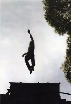 ![]() Playing the part of a vacationing newlywed husband, Davey Thompson plunges to the ground in the climactic "high fall" ending of the old Wild West Stunt Show at Knott's Berry Farm. --Photo by Stephen Burhoe, 1987. | |