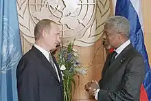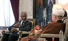 Kofi Atta Annan (/ˈkoʊfi ˈænæn/;[1] 8 April 1938 – 18 August 2018) was a Ghanaian diplomat who served as the seventh Secretary-General of the United Nations from January 1997 to December 2006.[2] Annan and the UN were the co-recipients of the 2001 Nobel Peace Prize.[3] He was the founder and chairman of the Kofi Annan Foundation, as well as chairman of The Elders, an international organization founded by Nelson Mandela.[4]