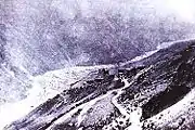 Another notable surge started on September 28, 1969. Because its onset occurred during a colder season with minimal presence of meltwater in the glacier's basin, the event was not catastrophic. By October 4, Kolka's tongue again reached the Maili glacier, having moved 1.3 km. After a month of relative calm, the glacier was on the move again by the beginning of November. A mass of fractured ice, 100–130 m thick, blocked the Upper Karmadon Springs and moved into the upper parts of the Glenadon valley, travelling at 20–50 m per day. By January 1970 it had stopped but, by then, the glacier had extended its length by 4.1 km and descended 800 m.[2]