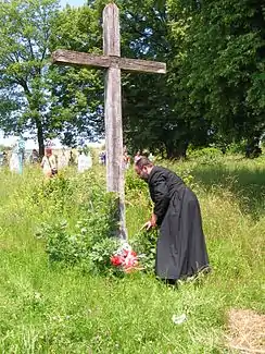 Currently, the only sign of the Korosciatyn Massacre is a wooden cross, which bears no inscriptions, placed in the local cemetery. The massacre is also commemorated with a special tablet, in the complex of Brother Albert Foundation in Radwanowice near Krakow.