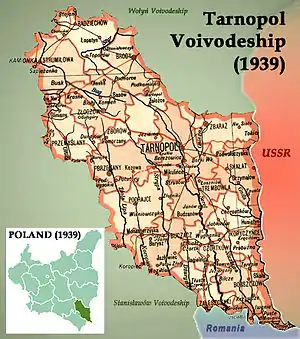 The Korosciatyn massacre took place on the night of February 28/29, 1944,[1] during the province-wide wave of massacres of Poles in Volhynia in World War II. Korosciatyn, which now bears the name of Krynica and is located in western Ukraine, was one of the biggest ethnic Polish villages of the interwar Poland’s within Buczacz County in Tarnopol Voivodeship (pictured). Located along the railway line from Tarnopol to Stanislawów, in 1939 it had some 900 inhabitants, all of them being ethnic Poles.[2] Korosciatyn had an elementary school, a Roman Catholic church and a railway station. It belonged to the Latin Rite Roman Catholic parish of nearby Monasterzyska, which also covered several nearby villages. Among the most famous of the citizens of this parish, are Rev. Stanislaw Padewski (bishop of the Roman Catholic diocese of Kharkiv), professor Gabriel Turowski (personal physician of John Paul II) as well as two scientists, professor Michal Lesiow of Lublin’s Maria Curie University and doctor Jan Zaleski of Krakow’s Pedagogical College.[3] Altogether, in 1939 the Deaconry of Buczacz had around 45 000 Polish inhabitants.[4]