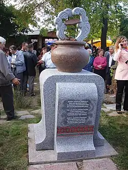 In 1926, Korosten received city status.[16] In October 1926, with the permission of the authorities and under the supervision of the OGPU, a conference of the rabbis of the Volyn province was held in Korosten, which actually had an all-Ukrainian, and partly all-Union character; which adopted a decree on counteracting atheistic propaganda.[17] In 1936, the city had a population 28,000, a porcelain factory, a metalworking factory "Oktyabrskaya Kuznitsa", car repair shops and a municipal power plant with a capacity of 20 kW operated here.[18]