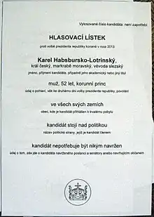 In 2013 Czech presidential election, the first direct presidential election in the country, KČ boycotted the election, as it was contrary to its goal of unelected head of state. At the same time, an independent monarchist candidate, sculptor Emil Adamec announced his candidacy, but he failed to gather enough signatures of citizens to become a candidate. Some members of KČ supported him,[4] while others urged the party to support the candidacy of Karel Schwarzenberg as an aristocrat and a personal friend of the royal house. KČ remained neutral, but issued a statement that is monarchists want to participate, then Schwarzenberg is the best choice.[5] Some KČ members also created mock ballots for Karl von Habsburg as an heir to the throne, which garnered some media attention.[6][7]