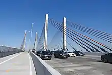In 2009, it was decided to replace the 1939 structure with a new bridge, which was to consist of a five-lane eastbound span, a four-lane westbound span, a bike path, and a walkway.[17] Four designs were considered for the new structure: a cable-stayed bridge, a through arch bridge, a box girder bridge, and a deck arch bridge.[18] The cable-stayed bridge design, selected after a public review process, makes the replacement bridge the first vehicular cable-stayed bridge in New York City since the Brooklyn Bridge (which has a hybrid suspension/cable-stayed design),[19] as well as the first major new bridge in New York City since the Verrazano-Narrows Bridge's completion in 1964.[19][20]
