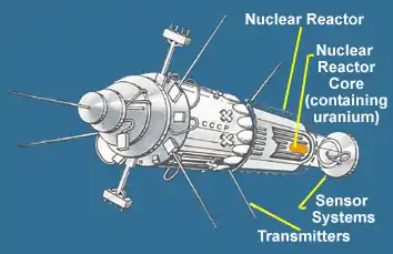 The satellite was part of the Soviet Union's RORSAT programme, a series of reconnaissance satellites which observed ocean traffic, including surface vessels and nuclear submarines, using active radar.[4] It was assigned the Kosmos number 954 and was launched on 18 September 1977 at 13:55 UTC from the Baikonur Cosmodrome, on a Tsyklon-2 carrier rocket.[5][6] With an orbital inclination of 65°, a periapsis of 259 kilometres (161 mi) and apoapsis of 277 kilometres (172 mi), it orbited the Earth every 89.5 minutes.[6] Powered by a liquid sodium–potassium thermionic converter driven by a nuclear reactor containing around 50 kilograms (110 lb) of uranium-235,[5][7] the satellite was intended for long-term on-orbit observation, but by December 1977 the satellite had deviated from its designed orbit and its flightpath was becoming increasingly erratic.[8]