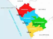 The district is divided into four taluks: Kozhikode, Vatakara, Koyilandy and Thamarassery. By the 2011 census there are 12 block panchayats: Balusseri, Chelannur, Koduvally, Kozhikode, Kunnamangalam, Kunnummal, Melady, Panthalayani, Perambra, Thodannur, Thuneri and Vatakara.[4]