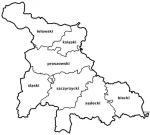 In 1138, following the Testament of Boleslaw III Krzywousty, the Duchy of Kraków was granted to Wladyslaw, the eldest son of Krzywousty. Boundaries of the duchy were most likely the same as boundaries of Kraków Voivodeship. In 1397, three counties were created: Kraków, Proszowice and Zarnowiec. In the 16th century, there were seven counties in the voivodeship: Proszowice, Szczyrzyc, Lelów, Książ Wielki, Silesian, Biecz and Nowy Sącz (...)