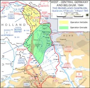 During the winter of 1944 -1945, the town of Kranenburg found itself in the middle of heavy fighting. In the nearby Klever Reichswald and the surroundings of the nowadays village of Kranenburg, Operation Veritable, also known as the Battle of the Reichswald took place. Taking place from 8 February till 11 March 1945, Operation Veritable was a part of General Dwight Eisenhower's "broad front" strategy to occupy the west bank of the Rhine, before attempting any crossing, conquest of the Ruhrgebiet industrial area, and eventual push towards Berlin. Veritable was originally called Valediction and had been planned originally for execution in early January, 1945. One day after the start of Operation Veritable on the 8th, the Germans blew the gates out of the largest Roer dam, sending water surging down the valley. The next day they added to the flooding by doing the same to dams further up stream on the Roer and the Urft. The river rose at two feet an hour and the valley downstream to the Meuse stayed flooded for about two weeks.