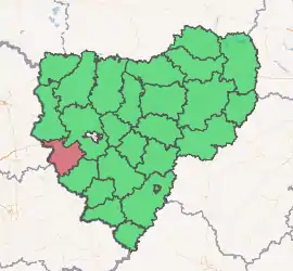 Krasninsky District (Russian: Кра́снинский райо́н) is an administrative[1] and municipal[5] district (raion), one of the twenty-five in Smolensk Oblast, Russia. It is located in the west of the oblast and borders with Rudnyansky District in the north, Smolensky District in the east, Monastyrshchinsky District in the south, Horki District of Mogilev Region of Belarus in the southwest, and with Dubrowna District of Vitebsk Region, also of Belarus, in the west. The area of the district is 1,507.67 square kilometers (582.11 sq mi).[1] Its administrative center is the urban locality (a settlement) of Krasny.[1] Population: 12,895 (2010 Census);[2] 15,537 (2002 Census);[7] 18,758 (1989 Census).[8] The population of Krasny accounts for 33.7% of the district's total population.[2]